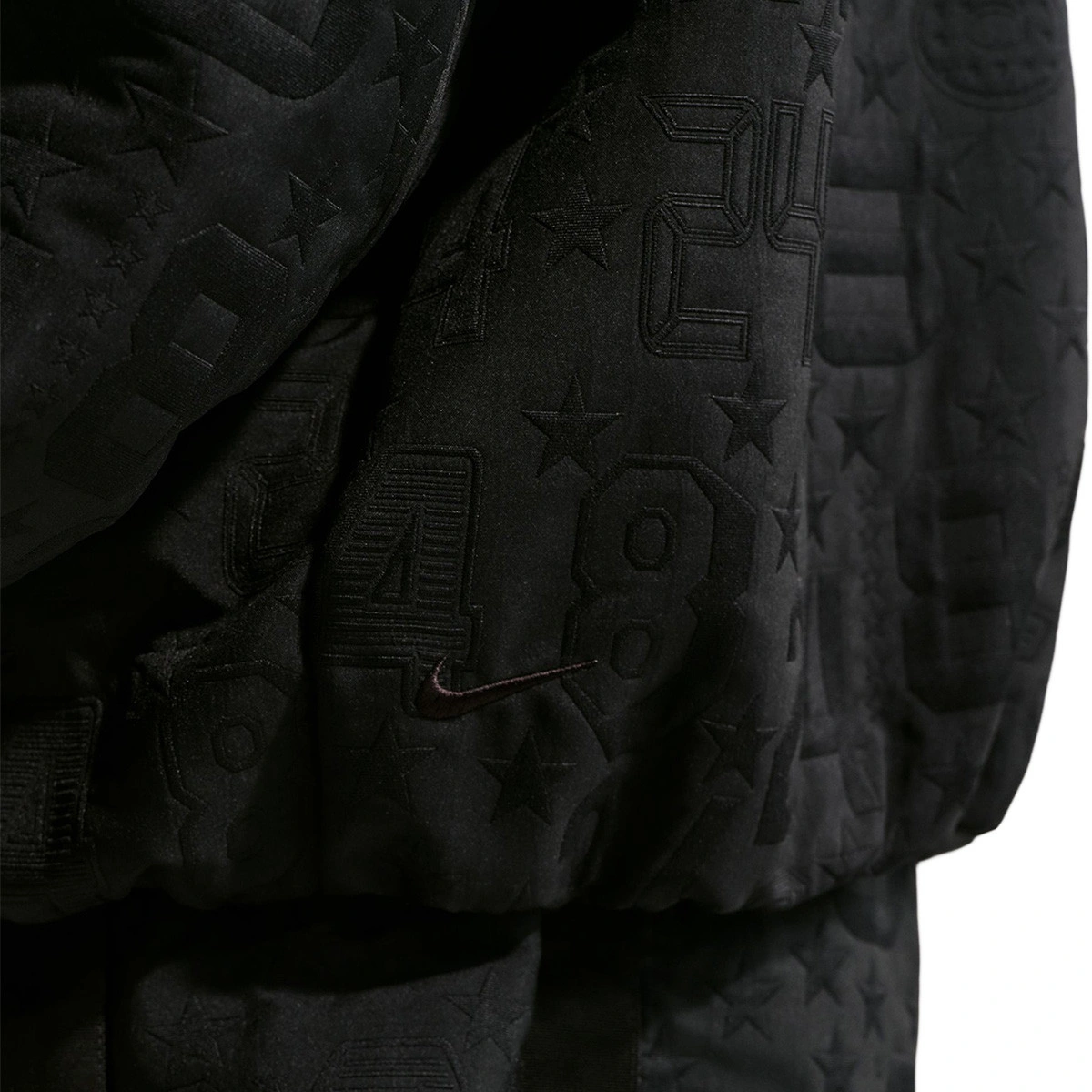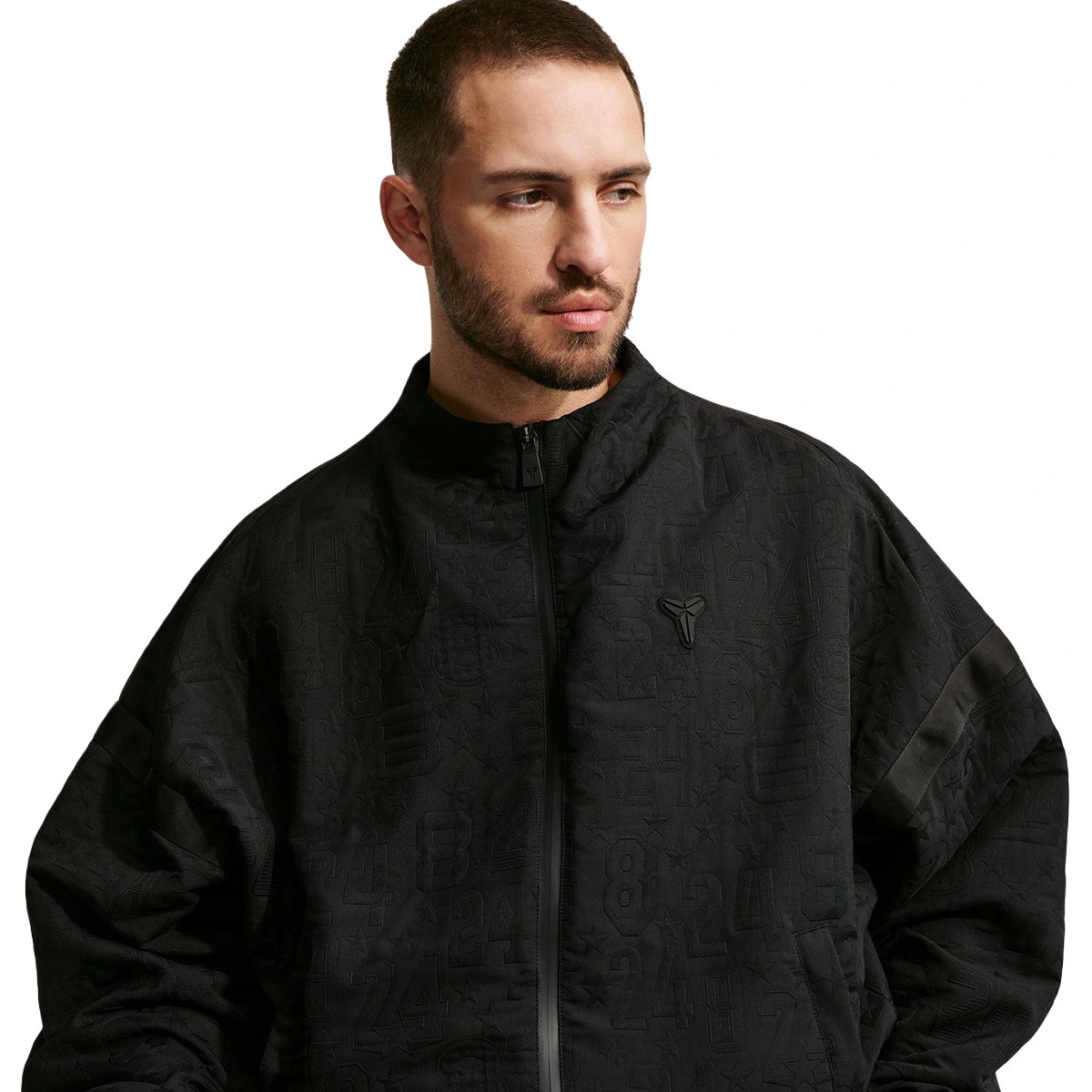 Questa speciale giacca in jacquard tessuto celebra i suoi successi individuali pieni di stelle e i sacri numeri di maglia che ha indossato su quel palcoscenico di metà stagione, attraverso materiali premium, dettagli di finitura e grafiche. Le maniche dolman basse e le spalle scese donano uno stile ispirato alla moda urbana.