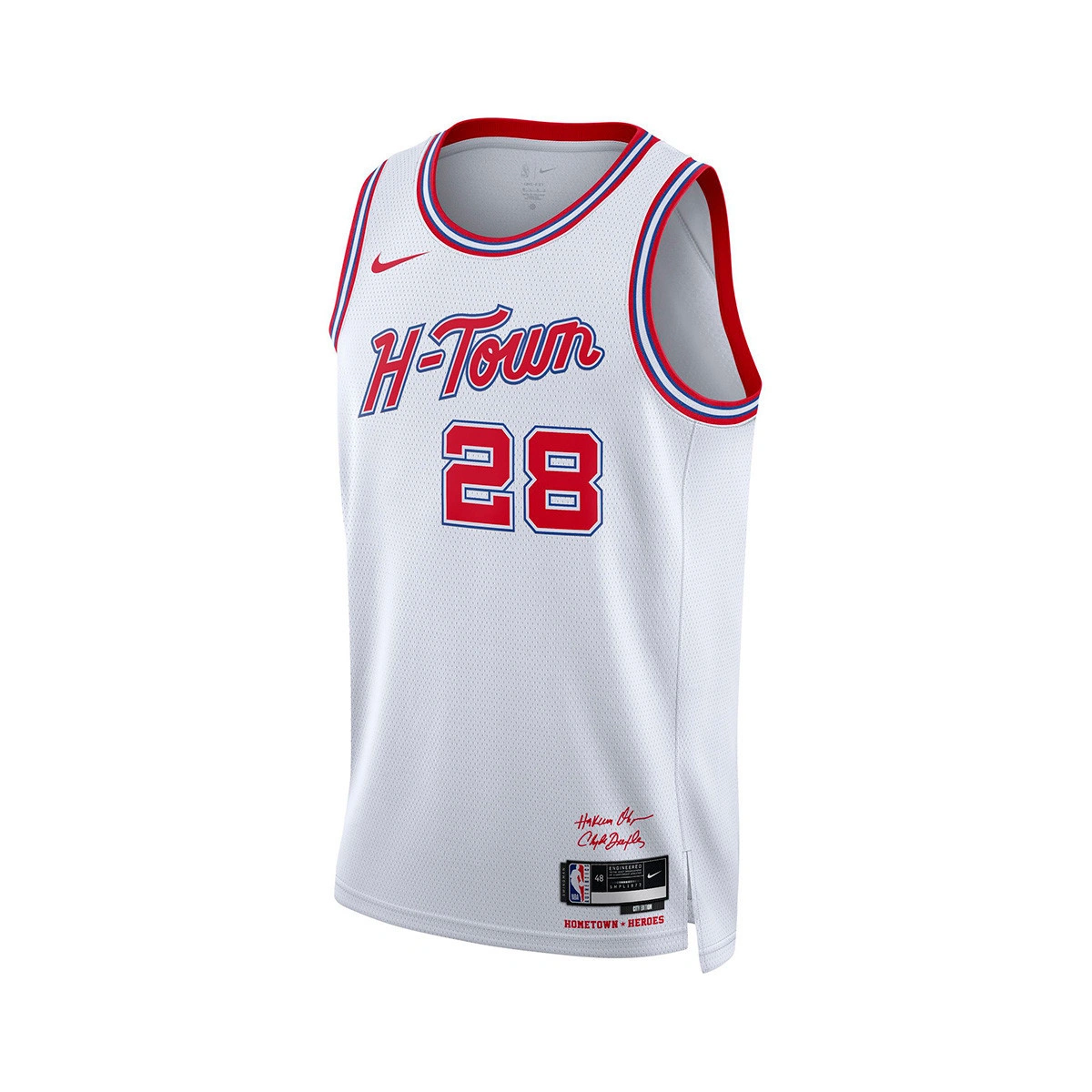 • Questa maglia combina elementi classici e moderni con lo stile elegante e attuale delle divise NBA, aggiungendo un tocco retrò di Houston. Hakeem e Clyde hanno aggiunto il tocco finale con le loro firme sull'etichetta.