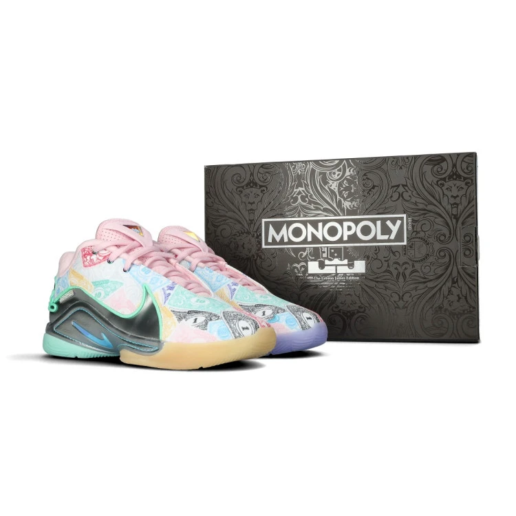 Questa versione "Currency" strizza l'occhio ad uno dei giochi da tavola preferiti di LeBron, il Monopoly, e al suo desiderio di fare scorte del proprio sforzo durante la routine quotidiana e che potranno essere vantaggiosi in futuro. Non perderti nessun dettaglio della sensazionale scatola, i due colori diversi dei lacci e la zona della linguetta che brilla al buio.